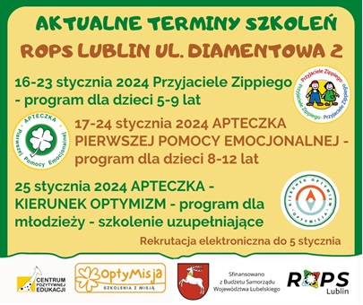Serdecznie zapraszamy do udziału w szkoleniach przygotowujących do realizacji programów: 1. Przyjaciele Zippiego dla dzieci w wieku 5-9 lat 16 i 23 stycznia 2024r (wtorki) godz. 9:00-15:00 Link do rejestracji: https://forms.gle/reB18VVJ5XDeAfWr9 2. Apteczka...