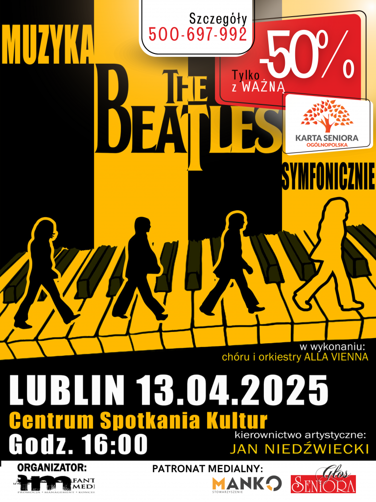 Zachęcamy Państwa do uczestnictwa w koncercie „THE BEATLES symfonicznie”, który odbędzie się 13 kwietnia 2025 r. o godz. 16.00, w Centrum Spotkania Kultur w Lublinie (pl. Teatralny 1). Dla posiadaczy ważnej Ogólnopolskiej Karty Seniora możliwość nabycia biletów z 50% zniżką (w cenie 90 zł lub 80 zł). Informacje o koncercie i kupnie biletów udziela Stowarzyszenie Manko pod nr telefonu: 500 697 992.