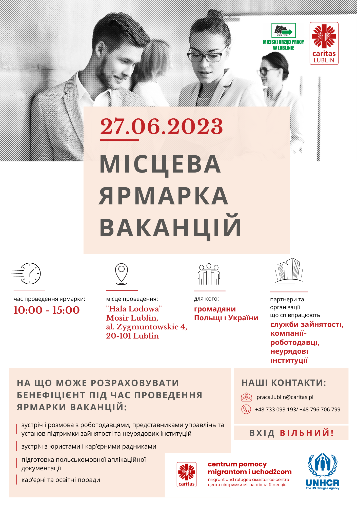 W imieniu Miejskiego Urzędu Pracy w Lublinie oraz Caritas Archidiecezji Lubelskiej serdecznie zapraszamy na Lokalne Targi Pracy , które odbędą się 27 czerwca 2023 r. w godz.: 10:00 – 15:00 w „Hali Lodowej” przy al. Zygmuntowskich 4 w Lublinie.