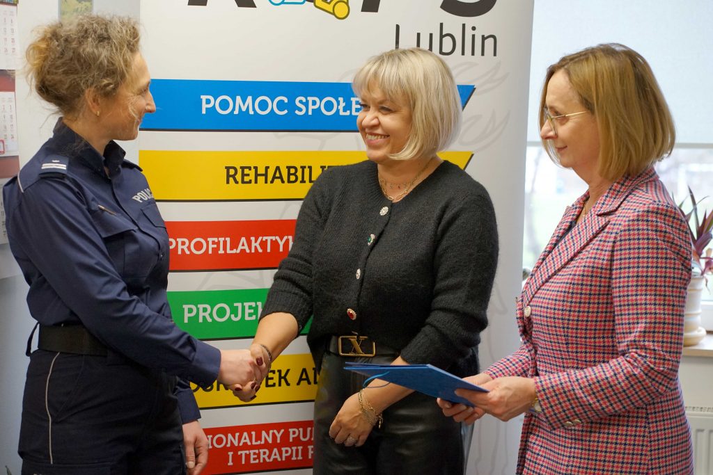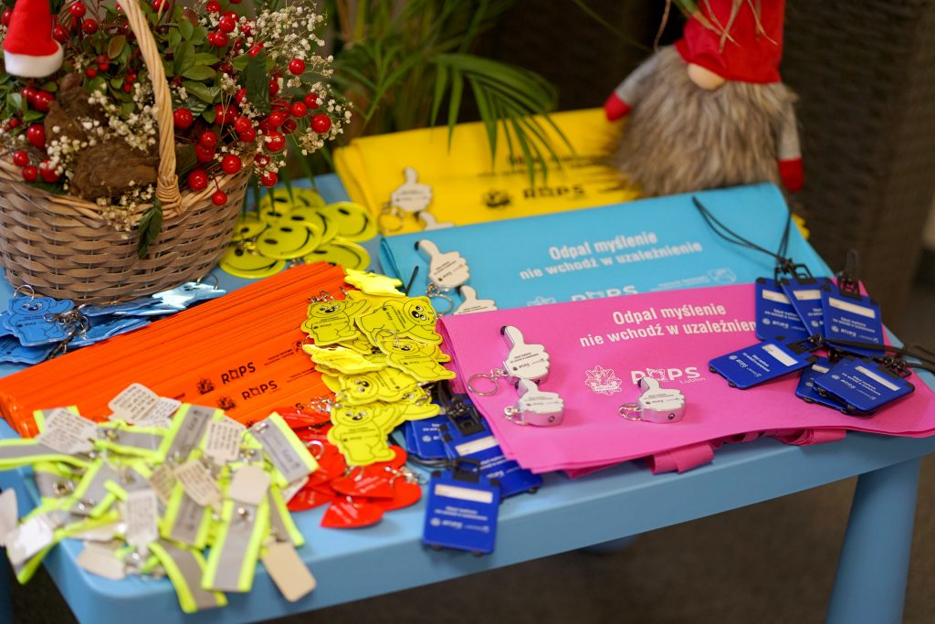 W siedzibie Regionalnego Ośrodka Polityki Społecznej w Lublinie odbyło się uroczyste przekazanie materiałów edukacyjno-informacyjnych na rzecz realizowanych przez Komendę Miejską Policji w Lublinie dwóch programów prewencyjnych pn.: „Odpal myślenie nie wchodź w uzależnienie” oraz „Trzeźwy umysł na drodze”. Ze środków Samorządu Województwa Lubelskiego na potrzeby akcji zakupione zostały: opaski odblaskowe, breloki do kluczy na taśmie odblaskowej, breloki z lampką LED, torby, skrobaczki do szyb. Wszystkie przekazane materiały oznakowane zostały logo instytucji samorządu województwa lubelskiego, logo ROPS, logo Komendy Miejskiej Policji w Lublinie oraz hasłem programu.