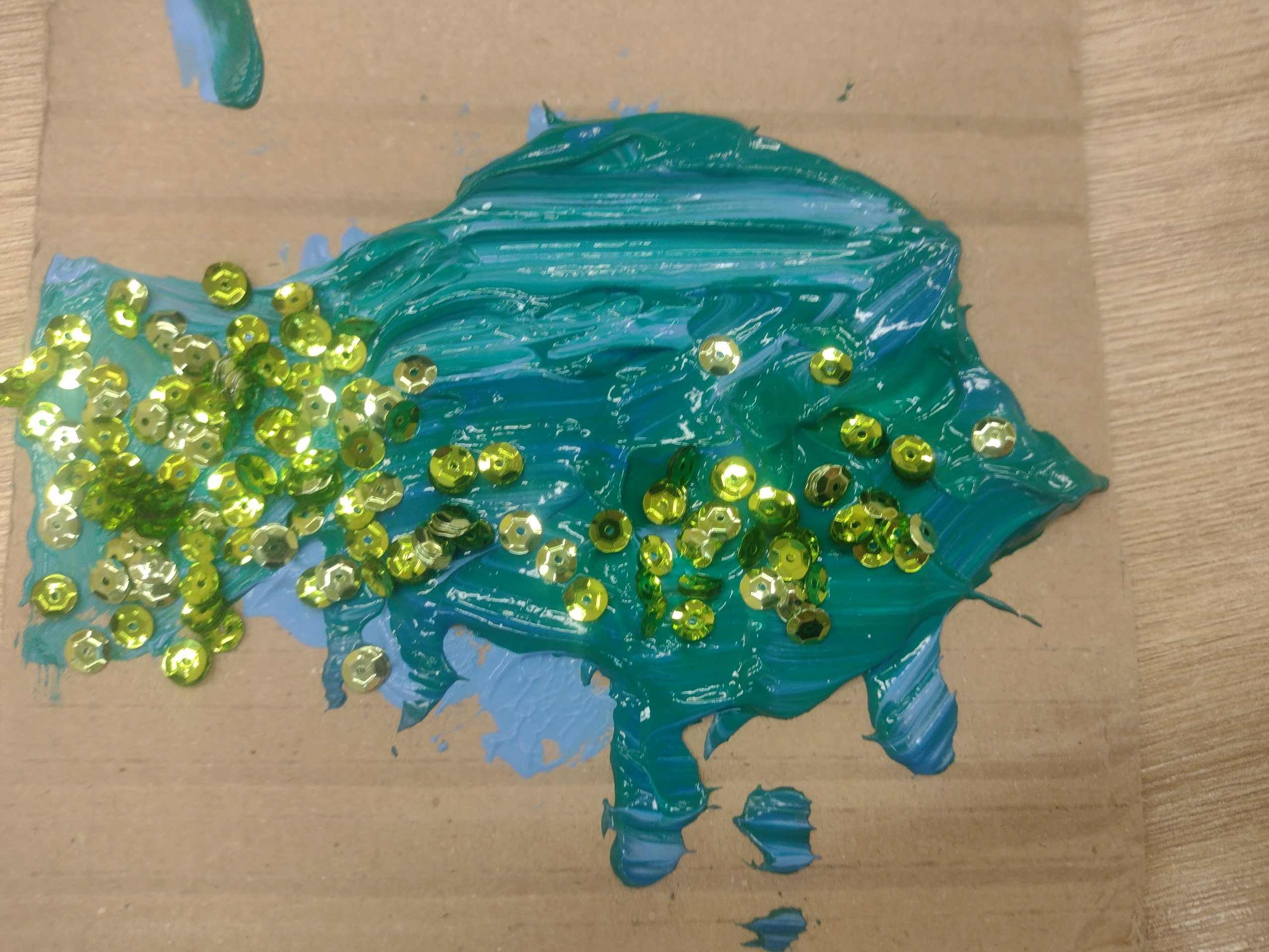 Zdjęcie niebieskiej ryby malowanej farbami ze złotymi łuskami z cekinów