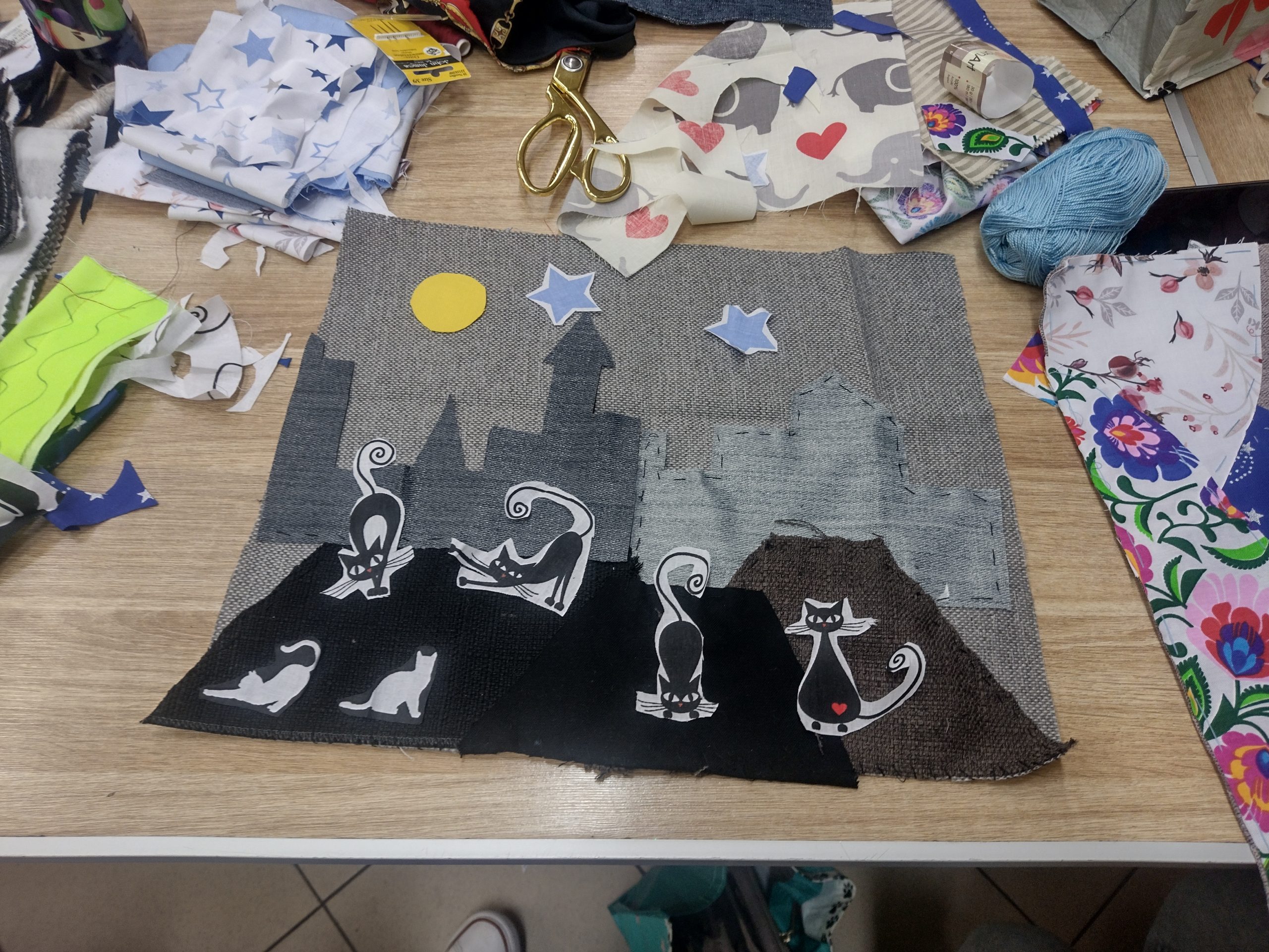 Sztuka dziecięca powstała podczas spotkań aktywizujących przeprowadzonych w warsztacie terapii zawodowej przedstawiająca obraz kotów nocą