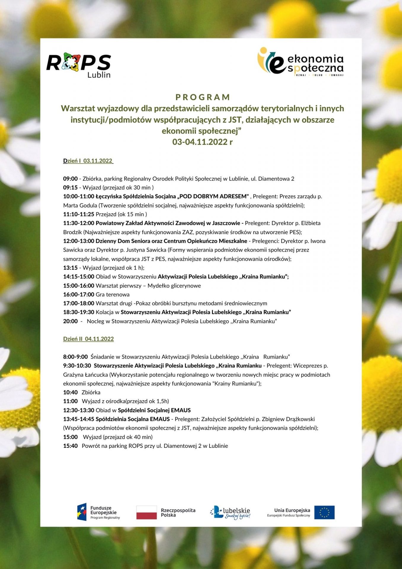 Warsztaty wyjazdowe realizowane są w ramach projektu „Ekonomia Społeczna – Drogowskaz Rozwoju Społecznego II” współfinansowanego przez Unię Europejską ze środków Europejskiego Funduszu Społecznego w ramach RPO WL na lata 2014-2020, Oś Priorytetowa 11 Włączenie Społeczne, Działanie 11.3 Ekonomia Społeczna.