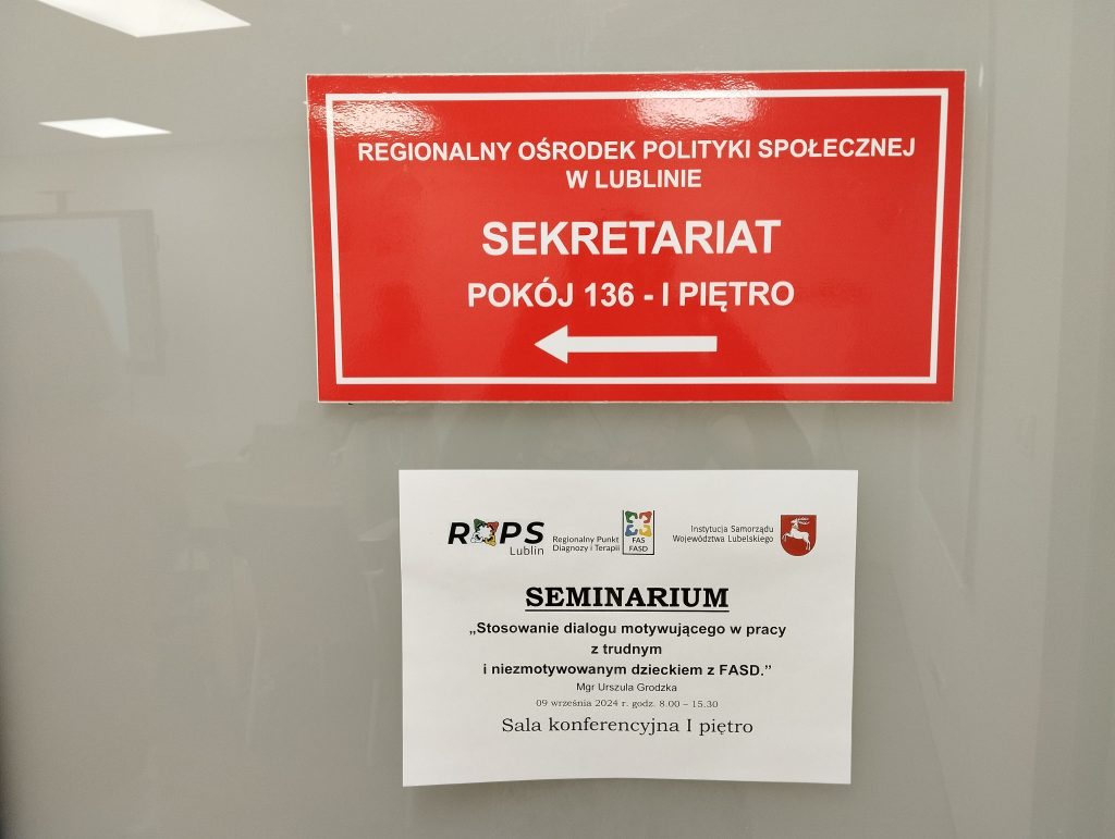 Z przyjemnością informujemy, że w ramach działalności edukacyjno-informacyjnej Regionalny Punkt Diagnozy i Terapii FAS/FASD w Lublinie w dniach 9 i 10 września br. zorganizował seminarium pt.: Stosowanie Dialogu Motywującego w pracy z trudnym i niezmotywowanym dzieckiem z FASD”. Szkolenie prowadziła Pani Urszula Grodzka – Dyrektor Centrum Dialogu Motywującego i Psychoterapii, socjoterapeuta, certyfikowany Terapeuta Motywujący.