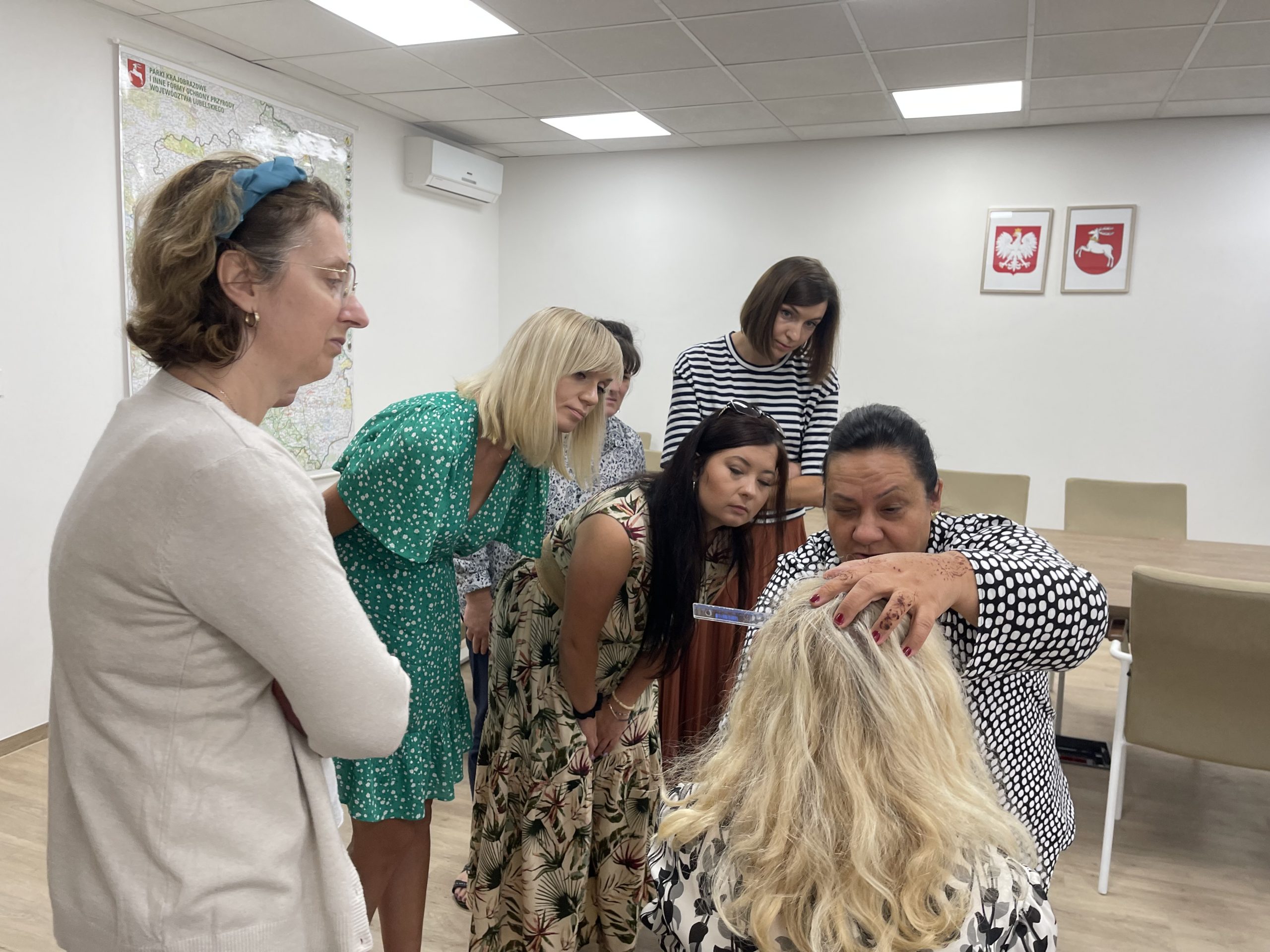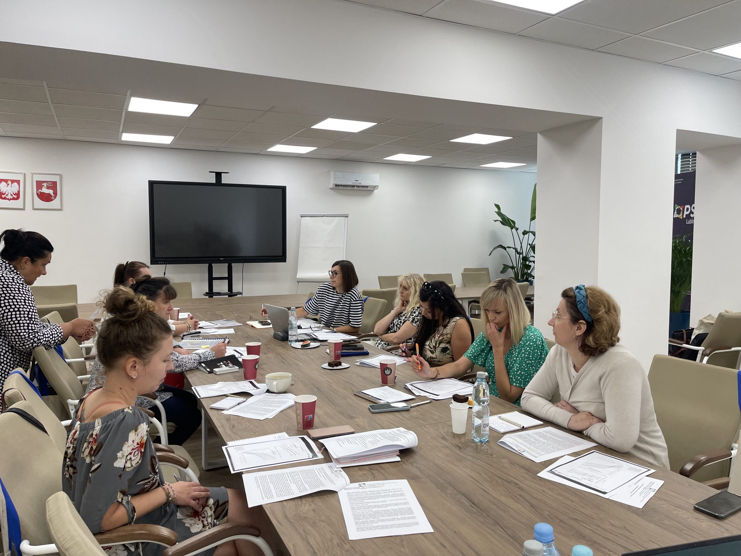 W dniu 13 września br. odbyła się superwizja i szkolenie pracowników i specjalistów prowadzących diagnozy w RPDiT FAS/FASD w Lublinie z Panią dr n. społ. Teresą Jadczak-Szumiło. Podczas pierwszej części spotkania miało miejsce omówienie dotychczas opracowanych diagnoz i wytyczenie kierunku ich przygotowywania. Pani Doktor Teresa Jadczak-Szumiło przekazała cenne sugestie w oparciu o własne doświadczenie. Podczas ćwiczeń praktycznych uczyłyśmy się mierzenia szerokości szpary powiekowej jako jednej z cech diagnozowanego FAS. Pracownice zespołu na własnym przykładzie mogły zobaczyć, że nie jest to wbrew pozorom wcale łatwe zadanie. Dla ciekawości możemy powiedzieć, że aby uzyskać rzeczywisty wymiar szpary powiekowej, potrzebne są dwa pomiary. Dla ułatwienia można zmrużyć oko i patrzeć po przekątnej. W drugiej części spotkania miało miejsce szkolenie Omawiane były wybrane elementy diagnozy, w tym drugorzędowe dysmorfie powstałe w wyniku wpływu alkoholu na płód dziecka. Pani Doktor przeanalizowała na przykładach poszczególne narządy i części ciała. Jej wypowiedzi ubogacały prezentowane slajdy ze zdjęciami.