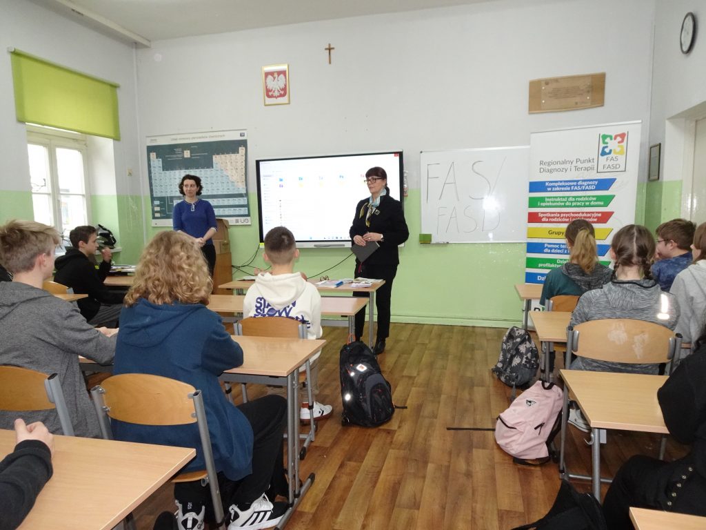 Pani Dyrektor, jak i pracownicy szkoły bardzo serdecznie przyjęli pracownika RPDiT. Odbiorcami wykładu na temat problematyki FAS/FASD byli uczniowie klasy VIII, nauczyciele i pedagog. Dużym ubogaceniem prelekcji była prezentacja lalki fantoma z zespołem FAS. Uczniowie naocznie mogli zobaczyć występujące cechy dysmorficzne i anatomiczne u dziecka. Wszyscy zaangażowali się w aktywną formę prelekcji i słuchali z zainteresowaniem. Na końcu pojawiły się też pytania. Młodzież wkraczająca w życie dorosłe i stojąca przez dokonaniem różnych wyborów i decyzji życiowych skorzystała z zaznajomienia się z problematyką FAS/FASD i konsekwencjami spożywania alkoholu przez kobietę w ciąży. Serdecznie dziękujemy pani Jolancie Mazuruk – dyrektorowi szkoły oraz pracownikom i uczniom za miłe przyjęcie. Na pewno długo będziemy pamiętali ten wyjazd.