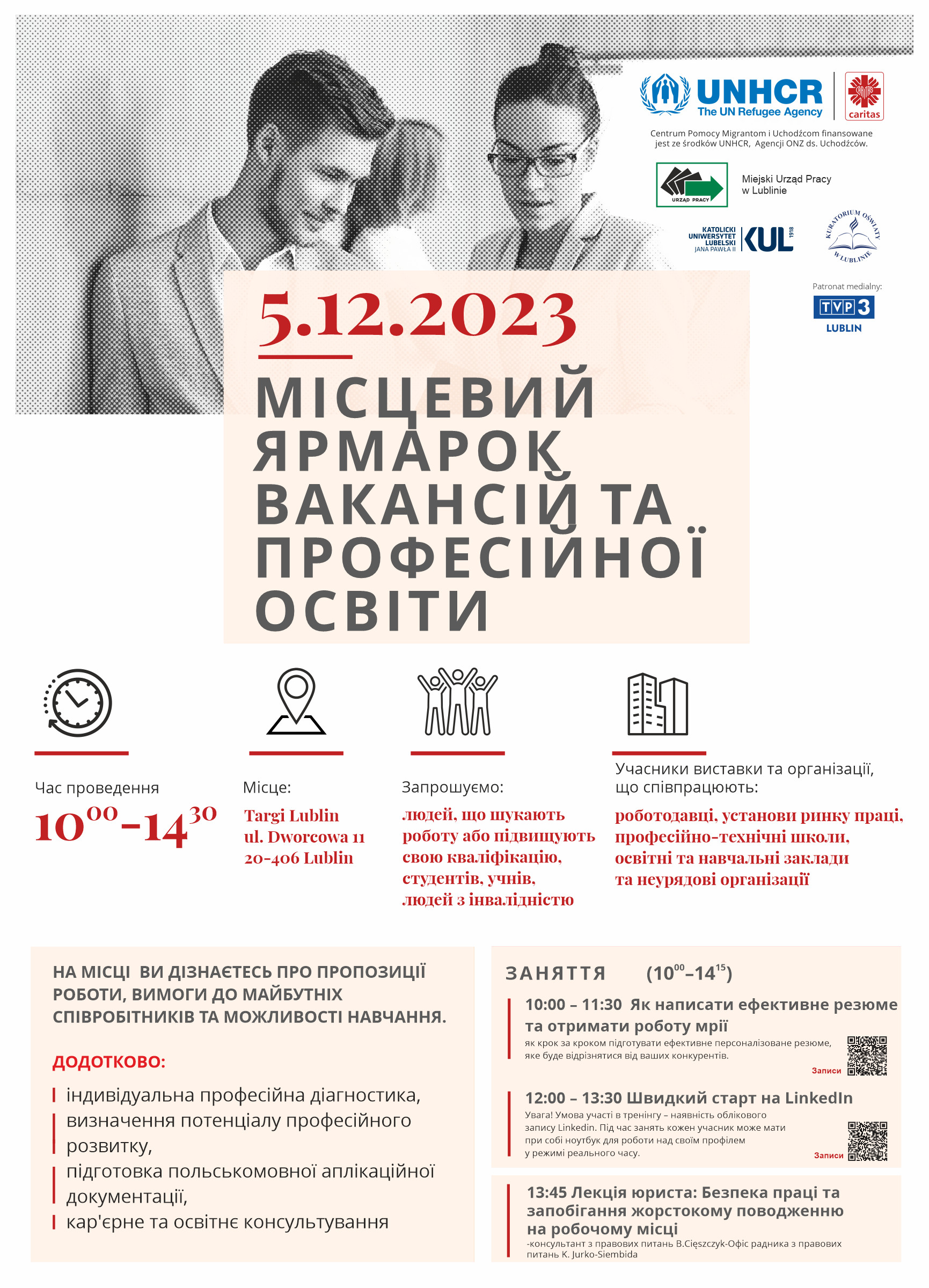 Miejski Urząd Pracy w Lublinie wraz z Caritas Archidiecezji Lubelskiej zaprasza na kolejną edycję Lokalnych Targów Pracy, które tym razem zorganizowano w rozszerzonej formule pt. Lokalne Targi Pracy i Edukacji Zawodowej. Targi odbędą się 5 grudnia w godz. 10.00-14.30 w Hali A Targów Lublin. Z tej okazji partnerstwo Caritas Archidiecezji Lubelskiej oraz MUP w Lublinie podjęło współpracę z Kuratorium Oświaty w Lublinie i Katolickim Uniwersytetem Lubelskim Jana Pawła II.